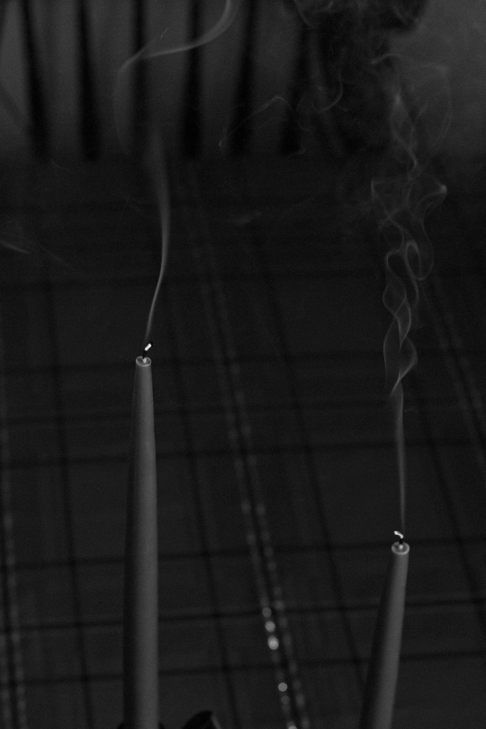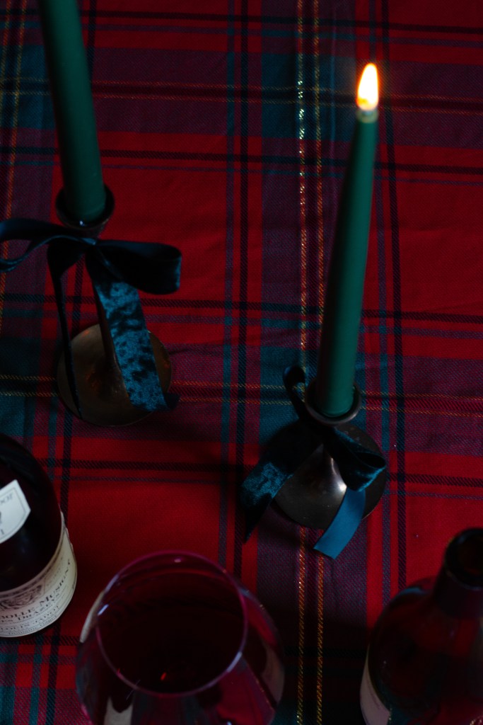 Burgundy was the color of Christmas this year. Burgundy with forest green velvet bows fastened to antique brass taper holders, green tapers flickering against bow and bottle. One thing I will never regret is collecting those brass candle holders. What is it about vintage holders and the low lumens of a live flame?